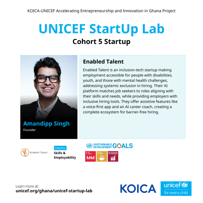 July 2025 – Brampton, Canada / Accra, Ghana — Enabled Talent, an inclusive employment platform using AI to bridge the disability employment gap, has been selected to join the prestigious UNICEF Startup Lab in Ghana. This milestone marks a significant step in the Brampton-based company’s vision to expand across Africa and deliver scalable, accessible job-matching tools for people with disabilities.